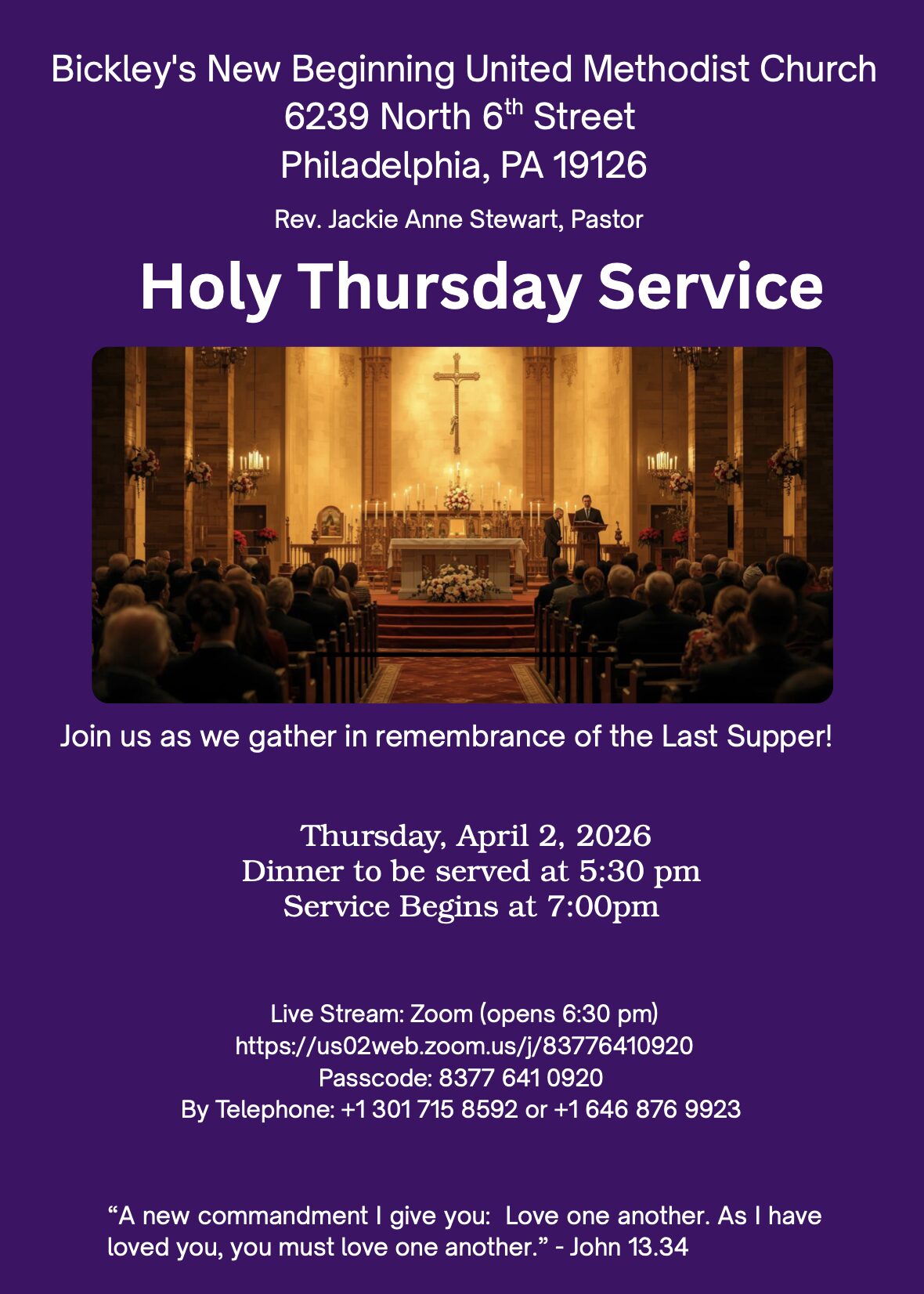 Welcome to Bickley's New Beginning United Methodist Church in Philadelphia, PA, where our vibrant community blends traditional and contemporary worship to create a nurturing, inclusive environment for all. With an array of ministries and a strong commitment to serving others, our church is known for its exceptional hospitality and family-like atmosphere. Join us at Bickley's New Beginning, where all are welcome, and together, we will embark on a faith journey filled with love, support, and spiritual growth